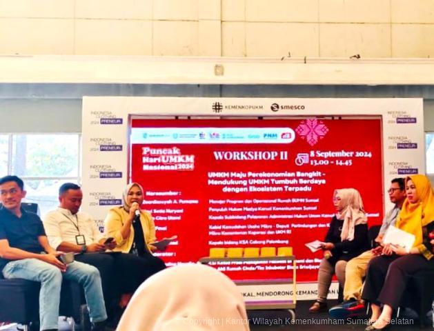 Palembang. Kantor Wilayah Kementerian Hukum dan HAM Sumatera Selatan turut ambil bagian pada Peringatan Puncak Hari UMKM Nasional Tahun 2024. Tim Divisi Pelayanan Hukum dan HAM menyampaikan sosialisasi mengenai layanan pendaftaran Perseroan Perorangan dan Kekayaan Intelektual, bertempat di area Dining Hall Jakabaring Sport City Palembang, Minggu (9/9).